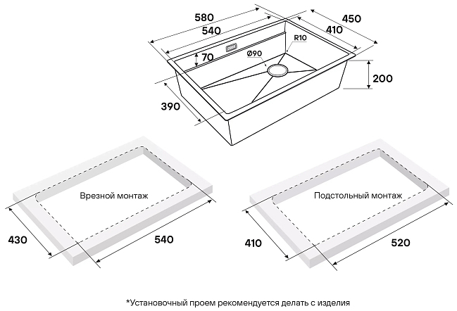 Установка: врезная, подстольный монтаж
