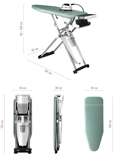 Общие характеристики:- Вид: гладильная система - Тип: с парогенератором- Материал подошвы утюга: шлифованный алюминий- Материал корпуса: пластик- Цвет: белый- Объем резервуара для воды: 1200 мл- Давление пара: 3,5 бар- Количество скоростей: 2- Количество вентиляторов: 1- Режимы работы: ваккуум, поддув- Время разогрева: 3 мин- Мощность: 2200 Вт- Размеры (ШхВхГ): 137x82x42 см - Размеры в сложенном состоянии (ШхВxГ): 42х137x20 см