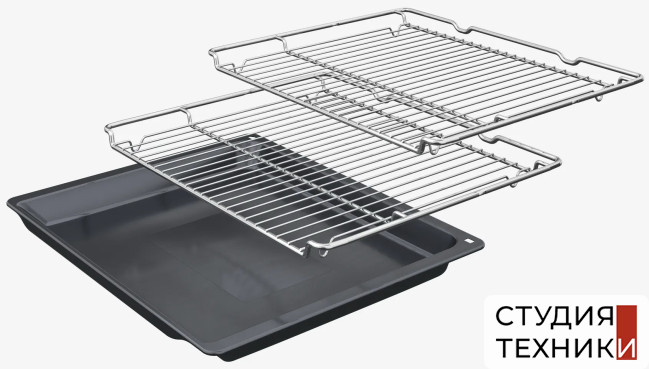 Принадлежности:- 1 эмалированный противень- 1 универсальный противень- 1 решетка- 1 большой поддон для приготовления на пару- 2 малых поддона для приготовления на пару- Телескопические направляющие- Термощуп