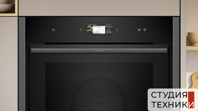 Управление, функции:- Сенсорная панель управления- Цветной русскоязычный графический дисплей 6,8"- Регулировка температуры в диапазоне 40-275 С- Индикация фактической температуры в духовке- Предложение по установке температуры- Автоматический быстрый разогрев- Многофункциональные часы EasyClock с таймером и программированием начала/ окончания приготовления