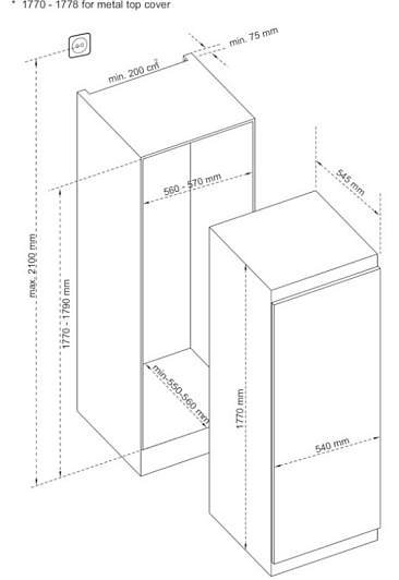 Общие характеристики:- Тип: встраиваемый- Вид: холодильник без морозильника- Количество камер: 1- Количество компрессоров: 1 - Разморозка холодильной камеры: капельная- Общий объем холодильника: 300 л- Цвет: белый - Уровень шума: 40 дБ- Класс энергетической эффективности: A+- Годовое потребление энергии: 144 кВтч/год- Размеры (ВхШхГ): 177х54х54.5 см- Размеры ниши для встраивания: 177х56х55 см
