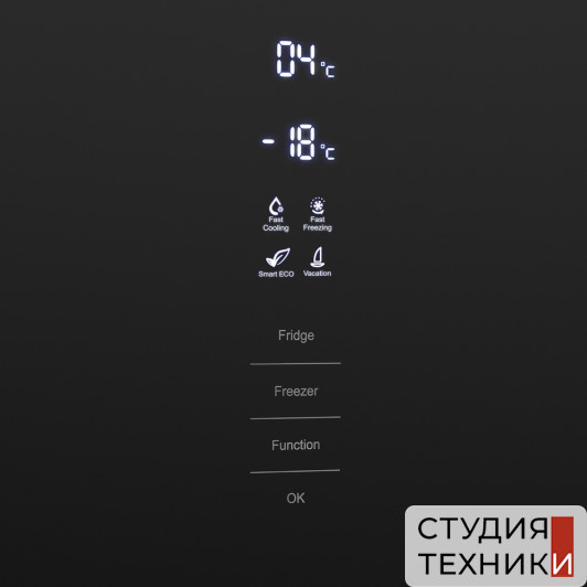 Управление, функции:- Элементы управления: сенсорные кнопки- Дисплей- Функция «Отпуск»- Функция «Быстрая заморозка»- Функция «SMART ECO»- Блокировка от детей- Сигнализация открытой двери- Сигнализация повышения температуры- Регулировка влажности в зоне свежести- Функция задержки включения (защита от повреждений при сбое питания)
