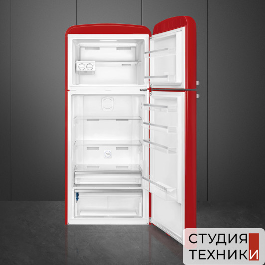 Общие характеристики:- Тип: отдельностоящий- Вид: холодильник с морозильником- Количество камер: 2- Количество компрессоров: 1- Разморозка холодильной камеры: No Frost - Разморозка морозильной камеры: No Frost - Общий объем холодильника: 524 л- Объем холодильной камеры: 400 л- Объем морозильной камеры: 124л- Дизайн: стиль 50-х годов- Цвет: красный- Количество дверей: 2- Дверной упор: справа- Расположение морозильной камеры: сверху- Уровень шума: 44 дБ- Класс энергетической эффективности: A++- Климатический класс: N-T - Годовое потребление энергии: 265 кВтч/год- Размеры (ВхШхГ): 192.1х79.6х80.5 см
