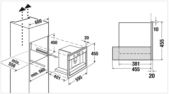 Общие характеристики:- Вид: автоматическая- Установка: встраиваемая- Цвет: серый- Кофе: молотый/зерновой- Вместимость: 2 чашки- Объем контейнера для воды: 1,8 л- Объем контейнера для кофейных зерен: 200 г - Давление при заваривании: 15 Бар- Мощность подключения: 1,35 кВт- Размеры (ВхШхГ): 45.5х59.5х47.5 см- Размеры ниши для встраивания (ВхШхГ): 45х56х55 см
