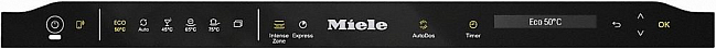Управление, функции:- Элементы управления: сенсорные кнопки- Дисплей: 1- строчный текстовый- Панель управления: закрытая- Таймер запуска 1-24 часа- Половинная загрузка- Автоматическое открытие дверцы после завершения программы- AutoDos со встроенным PowerDisk- Индикатор наличия ополаскивателя и соли- Индикация фильтра- Miele@home (беспроводное управление со смартфона)