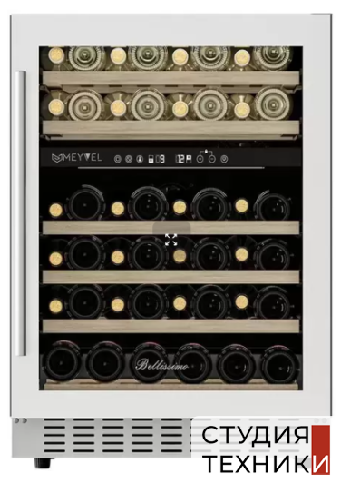 Винный шкаф MEYVEL MV46PRO-KWT2Общие характеристики:- Тип: отдельностоящий, встраиваемый- Вместимость, бут. 0,75л: 46 шт.- Количество температурных зон: 2- Диапазон регулировки температуры: 5-20 C- Цвет: черный/сталь- Уровень шума: 40 дБ- Класс энергетической эффективности: А- Годовое потребление энергии: 140 кВт- Размеры (ВхШхГ): 82х59.5х57.8 см Управление, функции:- Сенсорное управление- Электронный термостат- Светодиодная подсветка- Цифровой дисплей
