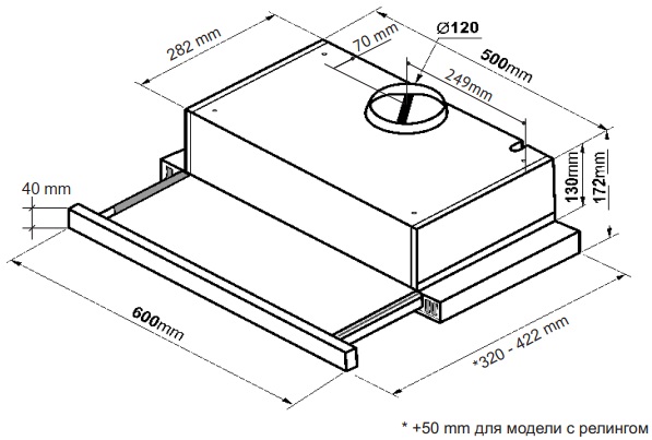 Дополнительная информация:- Жироулавливающий алюминиевый фильтр, пригодный для мытья в посудомоечной машине - предназначены для защиты двигателя, вентиляторов и отводящих труб от скопления мельчайших частичек жира, попадающих в воздух во время приготовления пищи. Фильтр легко снимается для очистки или замены- Угольные фильтры (приобретаются отдельно)- Данная модель имеет 3 режима работы, что оптимально для приготовления самых разных блюд. Например, когда готовятся несколько блюд одновременно, стоит включить максимальную скорость, то есть третий режим, а при приготовлении омлета или каши установите свою вытяжку на среднюю или минимальную скорость- Led освещение: 2х20 Вт- Штуцер для отвода воздуха ∅ 120 мм- Антивозвратный клапан- Количество моторов: 2- Рекомендуемая площадь помещения: до 13 м ²- Длина сетевого шнура: 1 м- Минимальная высота над газовой поверхностью: 75 см- Минимальная высота над электрической поверхностью: 65 см