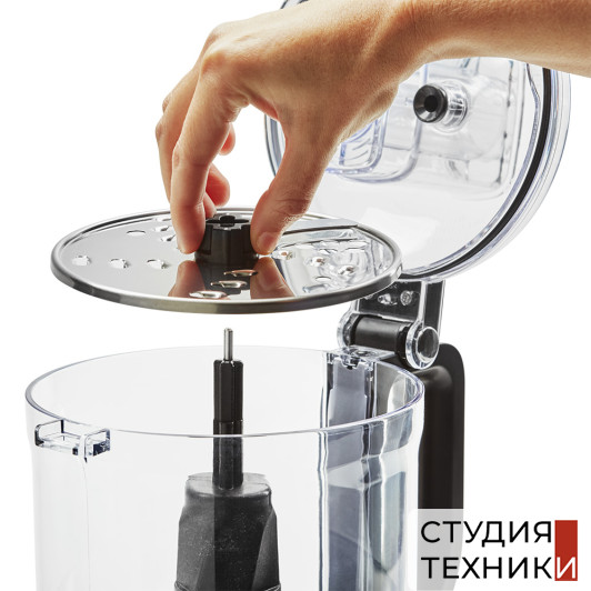 Комплектация:- Многофункциональное лезвие- Насадка для теста- Двусторонний диск для нарезки ломтиками средней толщины (4 мм)/шинковки- Диск только для нарезки ломтиками толщиной 6 мм- Рабочая чаша объемом 1,7 л из пластика без бисфенола А с приводным стержнем- Откидная крышка с падающей трубкой «2 в 1» и 2 – составной толкушкой- Адаптер привода- Место для хранения насадок