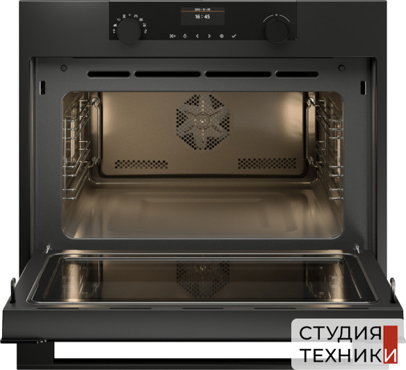 Общие характеристики:- Тип: электрический- Вид духовки: мультифункциональный компактный духовой шкаф с микроволнами- Дизайн-линейка: Craft- Цвет: антрацит- Цвет фурнитуры: вороненая сталь- Объем камеры: 50л- Количество уровней приготовления: 4- Количество режимов нагрева: 11- Количество режимов приготовления с СВЧ: 3- Количество авто программ: 124- Максимальная температура в духовке: 250 °С- Мощность микроволн: 1 кВт- Мощность гриля: 2.2 кВт- Очистка: паровая AquaClean- Мощность подключения: 3 кВт- Размеры (ВхШхГ) 45.5x59.7x54.7 см- Размеры ниши (ВхШхГ): 45x56-56.8x55 см