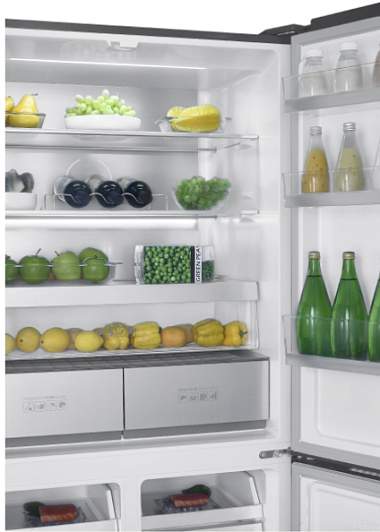 Холодильное отделение:- Задняя стенка Cold Metal- Освещение: Led- 3 полки из стекла- Количество полок на двери: 6 - Контейнеры для овощей и фруктов: 2- Зона свежести с изменяемым температурным режимом- Лоток для яиц
