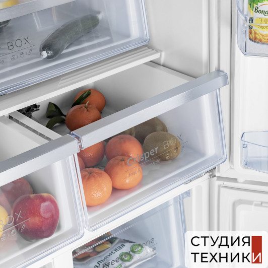 Холодильная камера:- 3 полки из закаленного стекла с металлической окантовкой- 8 боковых полок- 3 выдвижных корзины для фруктов и овощей- 2 лотка для яиц- Внутреннее освещение: Led подсветка