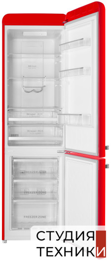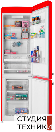 Общие характеристики:- Тип: отдельностоящий- Вид: холодильник с морозильником- Расположение морозильной камеры: снизу- Количество камер: 2- Количество компрессоров: 1- Разморозка холодильной камеры: NoFrost- Разморозка морозильной камеры: NoFrost- Общий полезный объем холодильника: 250 л- Полезный объем холодильной камеры: 178 л- Полезный объем морозильной камеры: 72 л- Цвет: красный- Уровень шума: 45 дБ- Класс энергетической эффективности: A+- Размеры (ВхШхГ): 186.5х54х60 см