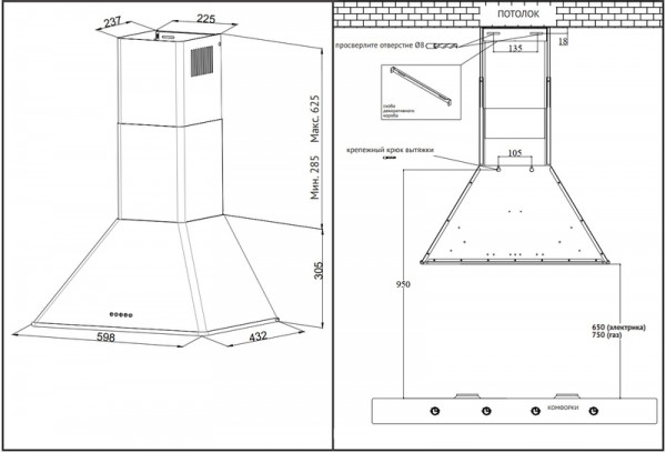 Общие характеристики:- Тип: купольная- Монтаж: каминная, настенная- Режим работы: отвод/рециркуляция- Уровень шума: 53 дБ- Цвет: черный- Цвет фурнитуры: золото- Материал корпуса: окрашенная эмаль- Максимальная производительность: 650 м.куб/ч- Количество двигателей: 1- Мощность подключения: 0,146 кВт- Диаметр воздуховода: 120/150 мм- Размеры (ВхШхГ): 28.5-62.5х59.8х43.2 см- Вес: 9,6 кг